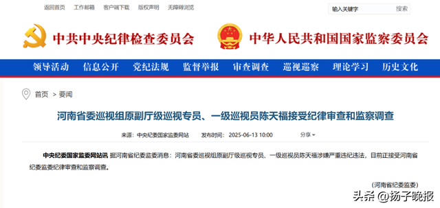 中央纪委国家监委网站讯 据河南省纪委监委消息:河南省委巡视组原副厅级巡视专员、一级巡视员陈天福涉嫌严重违纪违法,目前正接受河南省纪委监委纪律审查和监察调查。
