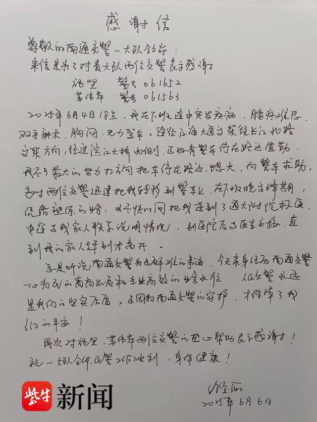 “人民交警永远是我们的坚实后盾,正因为南通交警的守护,才保障了我们的平安!”6月6日,南通市公安局交警支队一大队收到了一封手写的感谢信,当事人徐女士“点名表扬”一大队民警施坚和茅伟岸,字里行间满是感谢之情,讲述南通交警在危急时刻的及时救助。