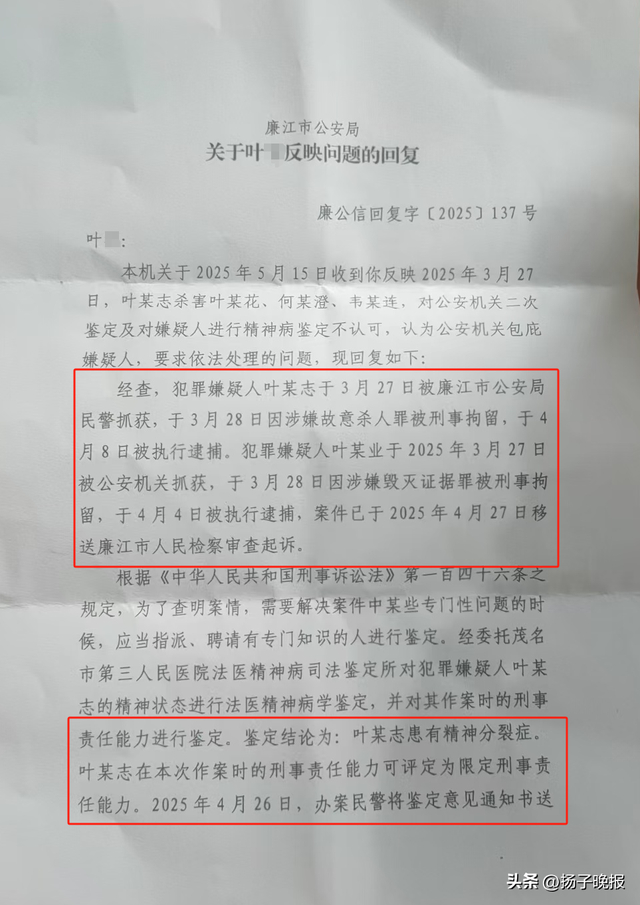 警方回复还显示,犯罪嫌疑人叶某业于3月28日因涉嫌毁灭证据罪被刑事拘留。叶女士告诉记者,叶某业系凶手叶某志父亲,案发后他帮助儿子把菜刀扔到了鱼塘里。