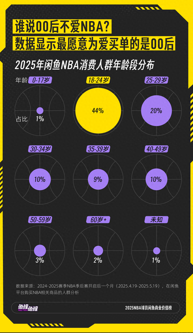 这份榜单还显示,目前平台篮球偏好用户达4000万规模,他们热衷在闲鱼交易球鞋、球星卡、球衣等篮球周边。18-24岁的00后和05后是NBA周边消费主力,占NBA消费人群的44%;25-29岁的95后人群占比20%,位列第二。