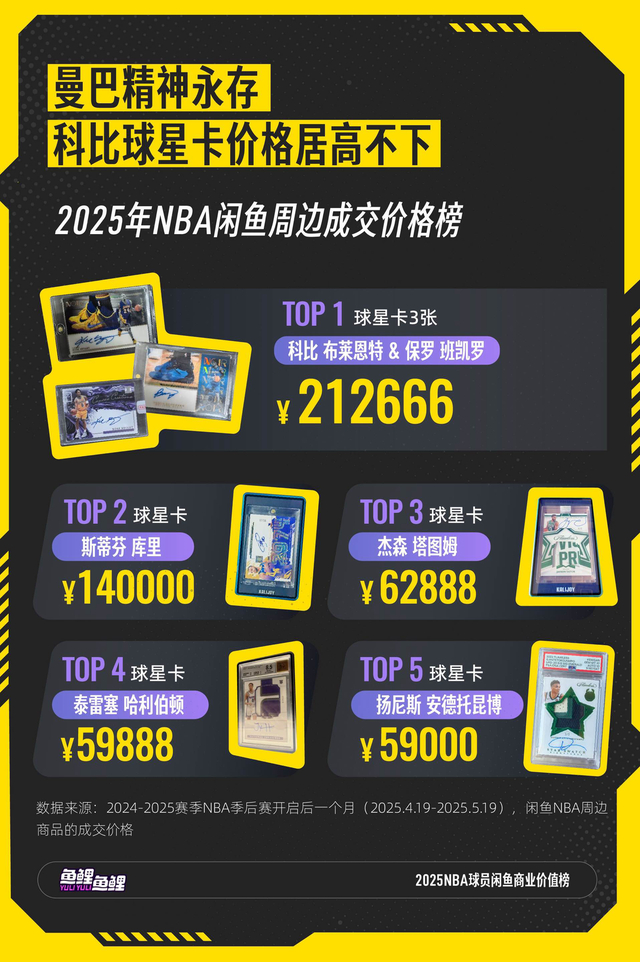 数据显示,以NBA球星卡为例,2025年4月至5月期间,科比·布莱恩特、斯蒂芬·库里、杰森·塔图姆、泰雷塞 ·哈利伯顿、扬尼斯·安德托昆博的球星卡成交价最高。三张科比和班凯罗的球星卡以总价212666元成交。