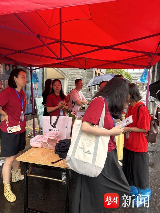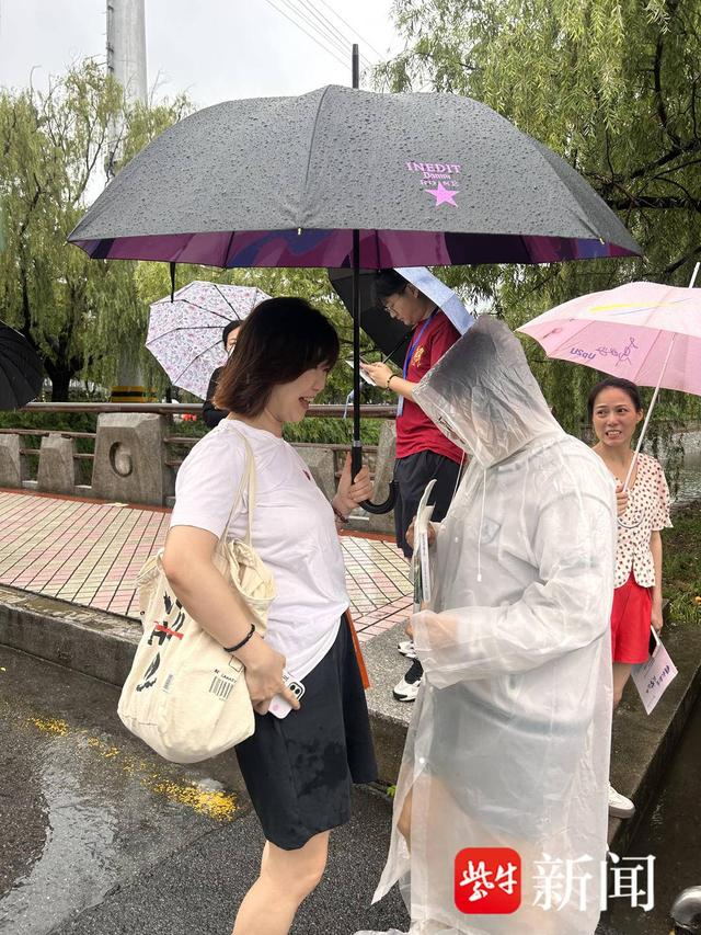 “哇,老师们好有仪式感!”一位家长看到身着统一红色T恤的老师们发出感慨。现场,新城初中黄山路分校的老师们身着写着“成功上岸”的红色T恤正在给考生发准考证,叮嘱他们沉着、冷静、细心。副校长常万志告诉记者,今天一共有校领导、初三班主任、语文任课老师二十多位老师来送考。“第一场考试非常重要,为了给学生一些情绪的舒缓和鼓励,我们学校统一购买了服装,让学生感受到老师们的热情,以更加饱满的状态沉着应考。”