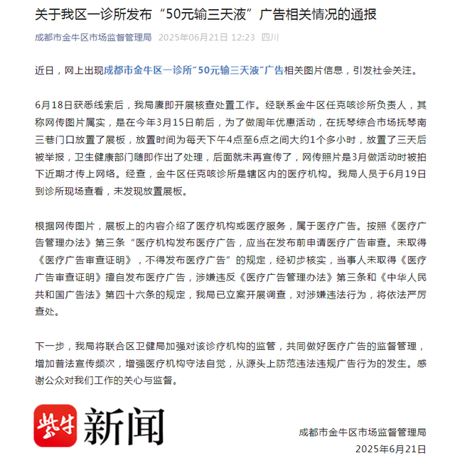 而就在21日中午,成都市金牛区市场监督管理局发布了“50元输三天液”广告相关情况的通报。该所称,6月18日获悉线索后,立即开展核查处置工作。经联系金牛区任克咳诊所负责人,其称网传图片属实,是在今年3月15日前后,为了做周年优惠活动,在抚琴综合市场抚琴南三巷门口放置了展板,放置时间为每天下午4点至6点之间大约1个多小时,放置了三天后被举报,卫生健康部门随即作出了处理,后面就未再宣传了,网传照片是3月做活动时被拍下近期才传上网络。经查,金牛区任克咳诊所是辖区内的医疗机构,6月19日到诊所现场查看,未发现放置展板。