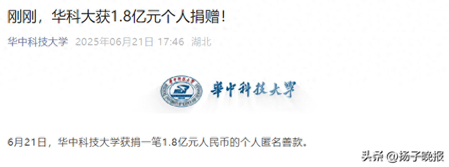6月21日,华中科技大学获捐一笔1.8亿元人民币的个人匿名善款。