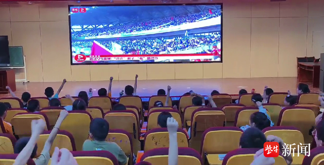 当天比赛正值周六,该校教练组组织校足球队全体170名队员,利用训练间隙时间,齐聚学校报告厅观看直播,为赛场上的宿迁队球员加油。观看现场气氛热烈非凡,每当宿迁队控球杀入禁区,孩子们都会兴奋地大声呐喊助威。尽管最终宿迁队以0:1憾负对手,但孩子们都被大哥哥们在场上的表现所感染。五年级学生施向楠说道:“大哥哥们虽然输了,但他们从第一秒战斗至最后一秒的身姿,依然是绿茵场上最动人的风景。”