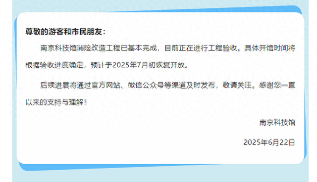 记者从公告中看到,南京科技馆消险改造工程已基本完成,目前正在进行工程验收。具体开馆时间将根据验收进度确定,预计于2025年7月初恢复开放。后续进展将通过官方网站、微信公众号等渠道及时发布。