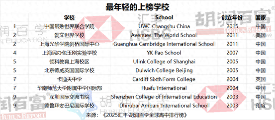 苏州外国语学校首登榜单;上海是上榜学校最多的中国城市,其次是香港。9所中国学校排名比去年上升,其中上海民办包玉刚实验学校大幅跃升22位,至第132名;广东碧桂园学校上升15位至第153名;上海市民办平和学校上升13位至第78名;最年轻的10所中有7所来自中国。