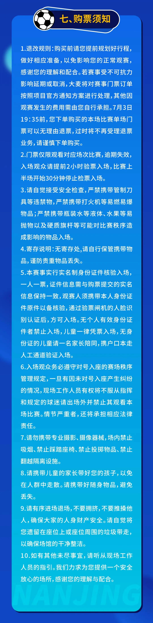 本场比赛采取线上实名制售票,现场不设售票点。购票时,需提供真实身份证信息,每张身份证限购1张门票。每个账号限购1笔订单,每笔订单最多可购买3张门票。7月3日19:35前,本场比赛单场门票可以无理由退票,过时将不再受理退票业务。特别提醒:请球迷朋友们通过官方购票渠道购票。