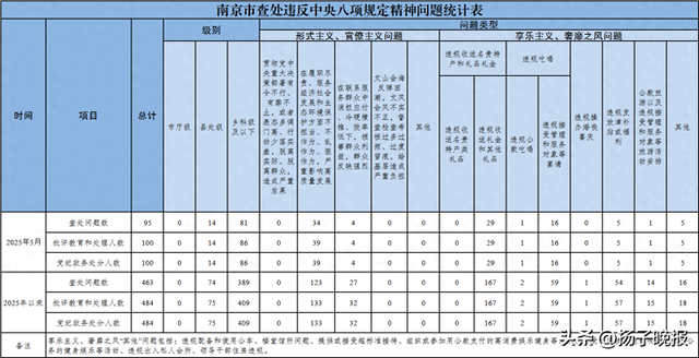 ▶ 2025年5月,全市共查处违反中央八项规定精神问题95起,批评教育和处理100人,其中党纪政务处分100人。