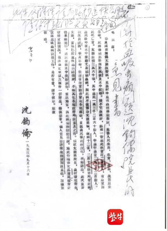 指示旋即下达!毛主席一方面将回信抄送中央各负责同志,一方面向时任政务院秘书长的习仲勋同志作出明确批示“血吸虫病危害甚大,必须着重防治!”