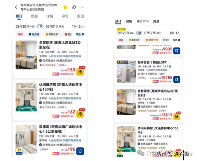 图/网络截图记者尝试联系上传视频的网友,但未获回应。记者随后在美团民宿平台搜索该酒店发现,6月30日晚,酒店奶油风大床房一晚价格为111元,而到了7月25日至27日,同款房型价格已飙升至5570元一晚,涨幅高达50倍。此外,休闲麻将房的价格也从162元上涨至14367元,涨幅高达88倍。