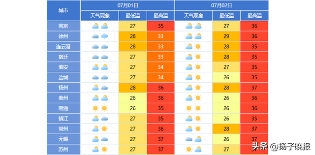 全省多云到晴。最高温度:全省35~36℃;最低温度:本省东南部地区25~26℃,其他地区27℃左右。全省偏南风4级左右。