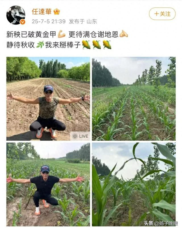 7月5日晚,中国香港著名演员任达华分享他在玉米地里的照片,配文“新秧已破黄金甲,更待满仓谢地恩”。