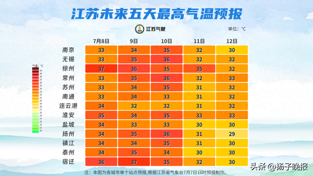 受其影响,7日夜里—9日淮河以南大部分地区有阵雨或雷雨,风力逐渐增大,随着副热带高压强度逐渐减弱,本周高温天气将有所缓解,8日江苏南部地区的最高气温降至33—35℃。