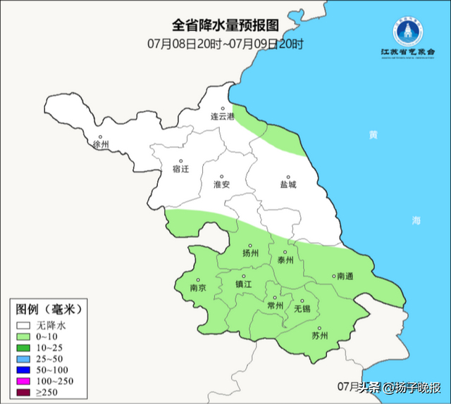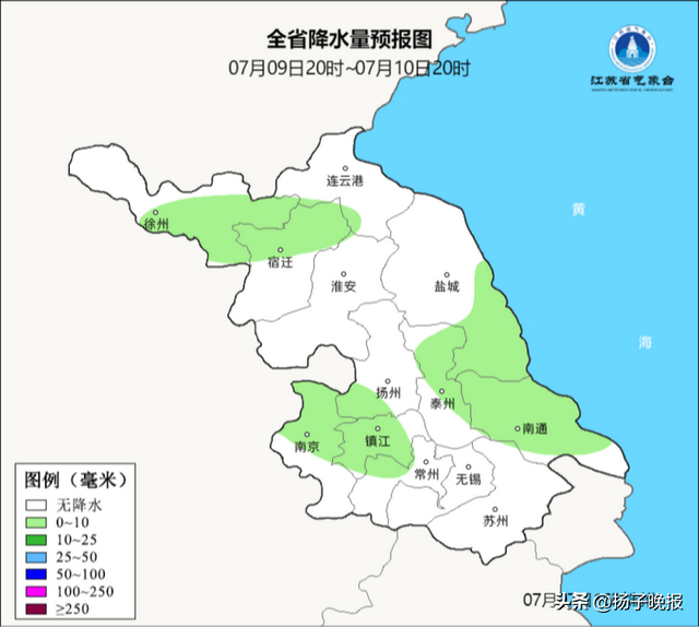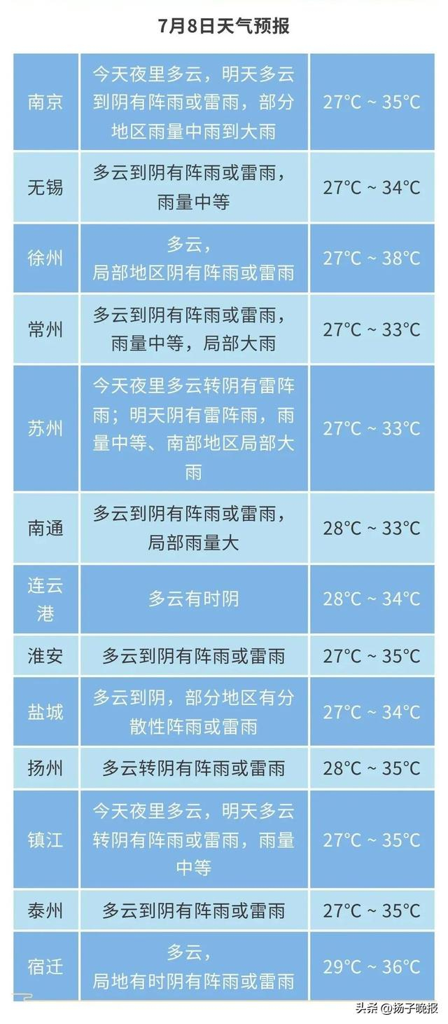 沿江和苏南地区多云到阴有阵雨或雷雨,其他地区多云,局部有阵雨。最高温度:淮北地区36℃左右,苏南地区32~33℃,其他地区34~35℃;最低温度:淮北北部地区25℃左右,其他地区26~27℃。全省偏东风4—5级阵风6—7级。