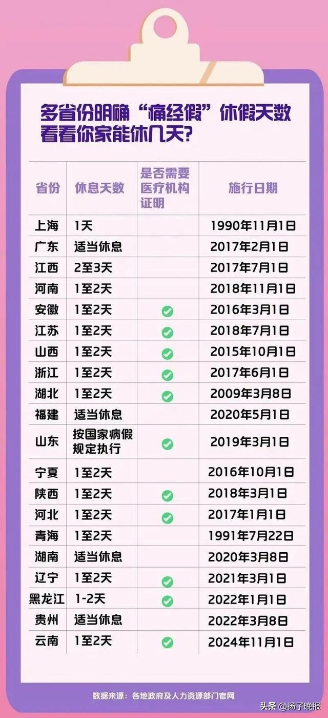 据最新统计,目前全国已有包括北京、上海、广东、浙江、云南等约20个省市,在地方性规定中明确了女性劳动者的这一权益,休息时间普遍在1~2天,最多的是3天。