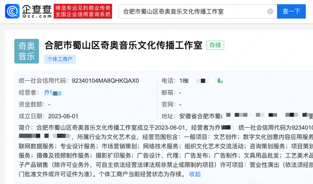 据悉该演唱会定价在268元到968元之间,于7月19日17:29开票。7月22日查询演出购票平台发现,仍有768、968两档座位余票。此外查询企查查信息发现,乔某(旺仔小乔)曾于2023年出资成立合肥市蜀山区奇奥音乐文化传播工作室,经营范围包含文艺创作、组织文化艺术交流活动等。
