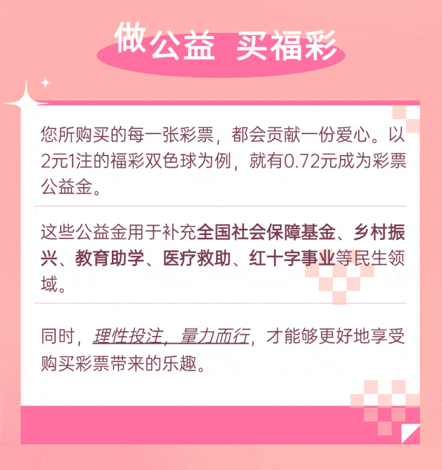 记住:彩票是娱乐,生活才是主旋律!中国福利彩票也一直倡导“多人少买、寓募于乐、理性购彩、量力而行”。