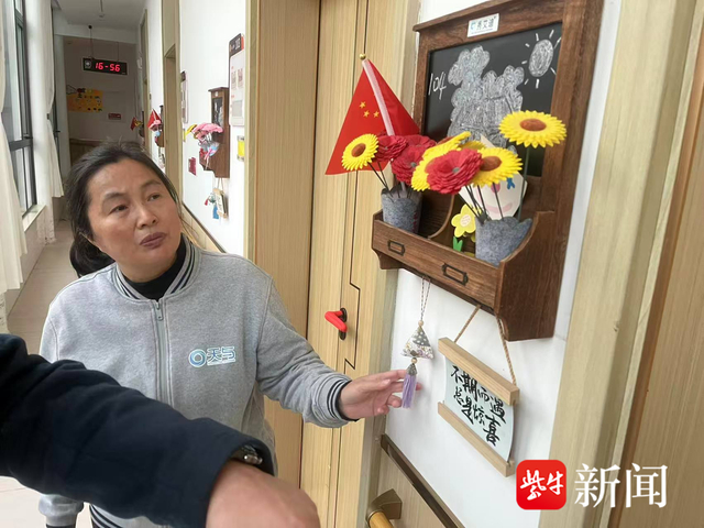 记者看到,每间房门口的墙上还挂着手工做的工艺花篮,花篮里插着玫瑰干花等。“花篮是护理员带着老人一起做的。做手工的目的是让老人多动手、多健脑。花篮做好后挂在房间门口。一些老人健忘不记得自己住哪个房间,但看见自己做的花篮就认得‘家’了。”杭慧芹说。