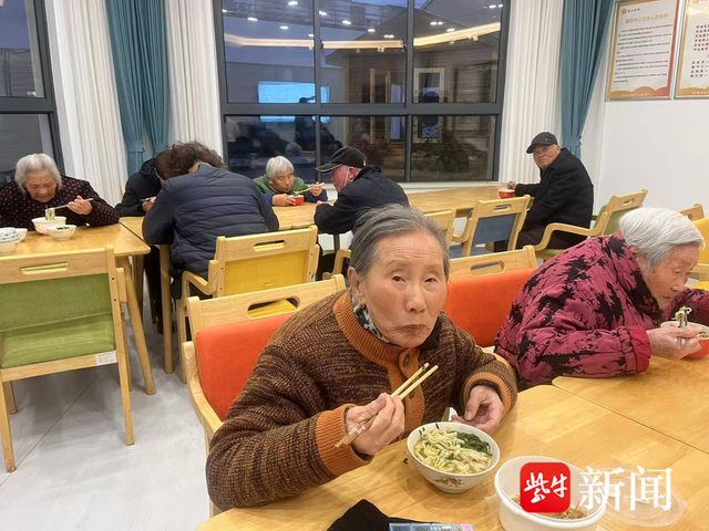 晚饭时间到了,在一楼集体餐厅,老人分坐在适老桌旁,工作人员将分好的晚饭端到各人面前。93岁的韩奶奶是服务中心第一批入住的老人。提及这里的饭菜,老人连连夸奖:“好吃,好吃。”当晚老人们吃的是面条,面条软而不烂,味道调得恰到好处,每碗上面还有浇头,“中饭是套餐,一大荤、一小荤、一素菜,还有一碗汤。”