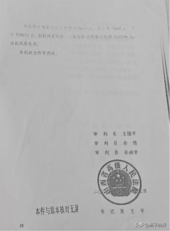 赵凤莲说:“首先,山西省高院主审法官王国平无视《转让协议》资产无法实际交付的事实,仅一句商业风险应由我自己承担,明显违背客观事实,也根本不考虑该《转让协议》能否客观履行,更没有考虑判决是否能够解决双方的实际问题,无法让人信服。