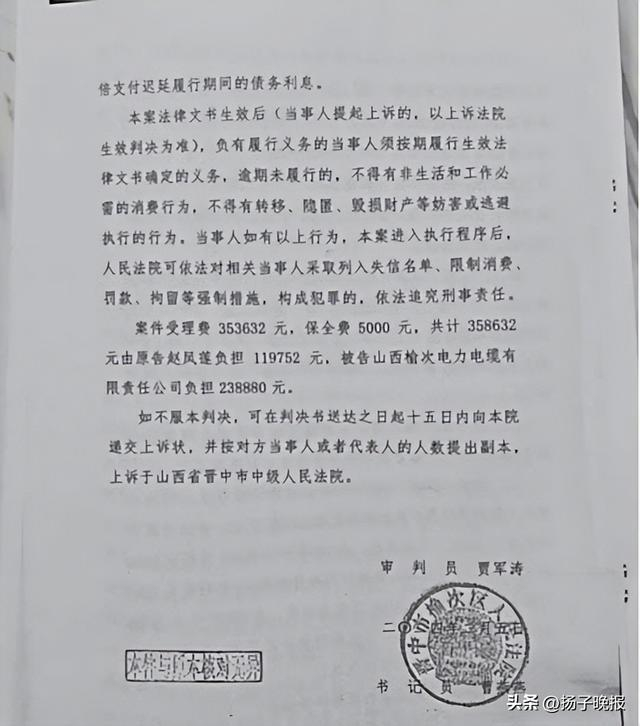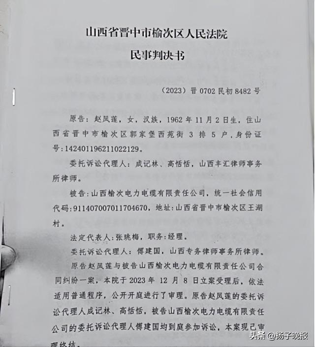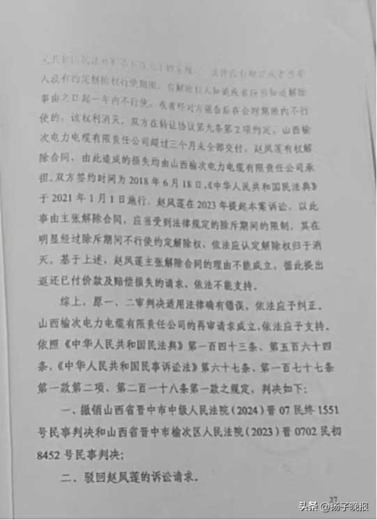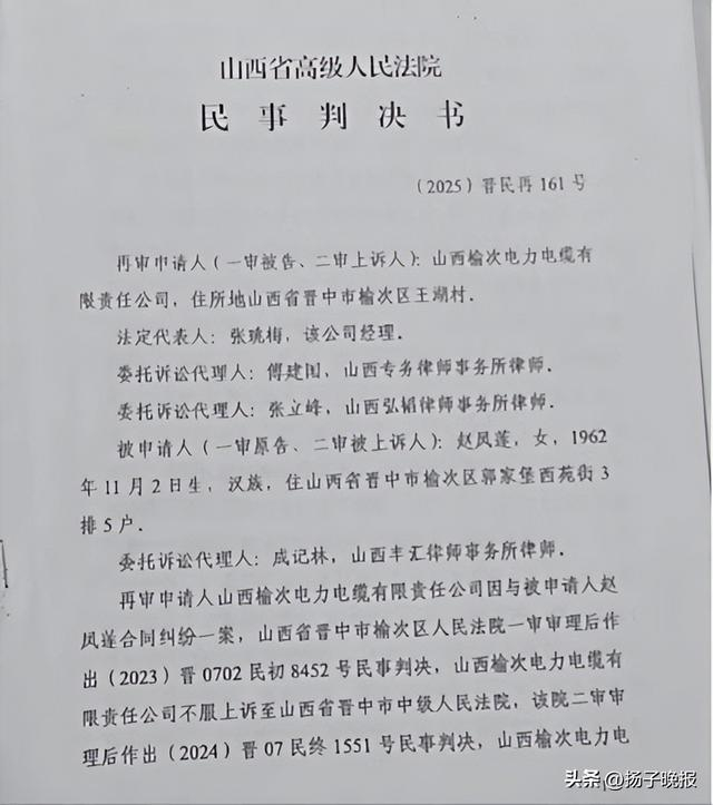 拿到晋中市中级人民法院的终审判决之后,赵凤莲压在心头多年的石头终于搬开,正当她静待榆缆公司履行判决义务的时候,榆缆公司依然表示不服,于2024年7月19日向山西省高级人民法院提出再审申请。