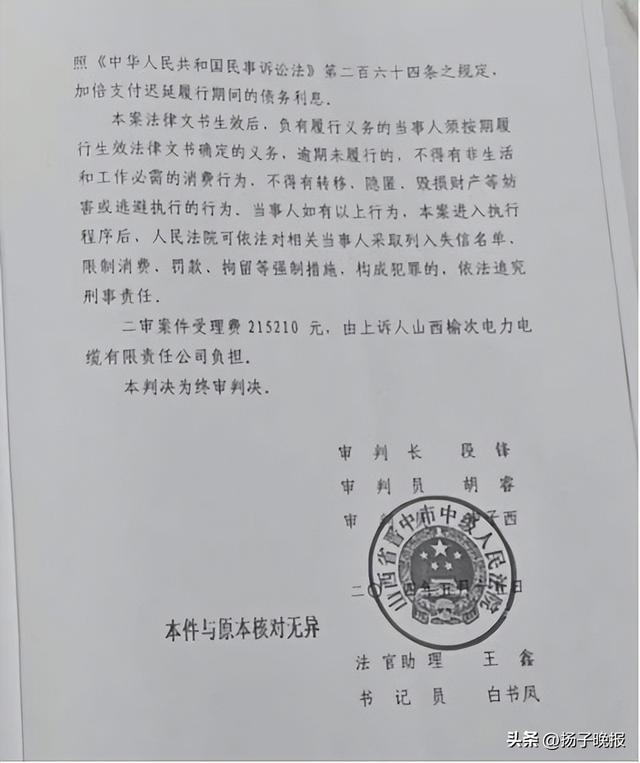 晋中市中级人民法院依法对本案进行公开审理(注:主审法官段锋),认为上诉人榆缆公司的上诉请求不能成立,应予驳回;一审判决结果正确,应予维持。