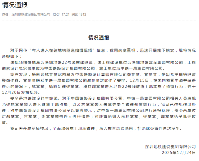 记者注意到,就在今天(24日)傍晚,深铁建设集团就此发布了情况通报。通报称,对于网传“有人进入在建地铁隧道拍摄视频”信息,我司高度重视,迅速开展线下核实,现将情况通报如下: