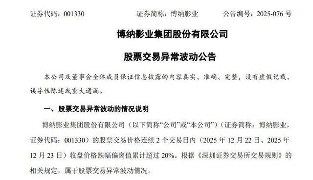 12月23日晚,博纳影业发布股价异动公告。博纳影业披露,公司股票交易价格连续2个交易日内(2025年12月22日、2025年12月23日)收盘价格跌幅偏离值累计超过20%。根据《深圳证券交易所交易规则》的相关规定,属于股票交易异常波动情况。