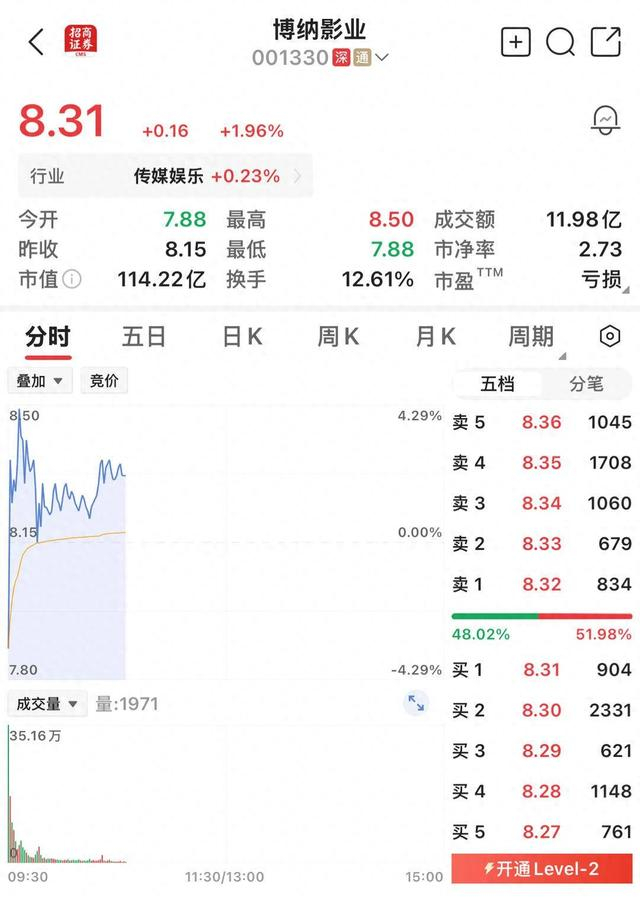 今日早盘,截至发稿时,博纳影业今日上涨1.96%。