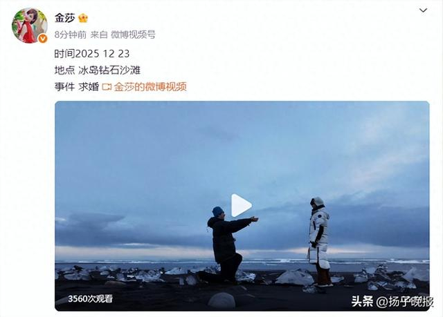 12月24日,演员金莎、孙丞潇双双发视频宣布求婚成功。视频中,孙丞潇求婚成功后抱住了金莎,两人在唯美浪漫的冰岛钻石沙滩上拥吻。