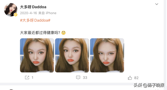记者注意到,Daddoa最后一次在微博发布动态是2020年4月16日,当时她发了三张自拍照,并留言:大家最近都过得健康吗?