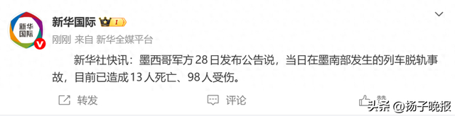 新华社快讯:墨西哥军方28日发布公告说,当日在墨南部发生的列车脱轨事故,目前已造成13人死亡、98人受伤。