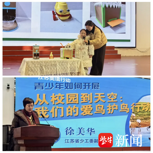 伴随着悠扬的学生合唱《踩到猫》《声声慢》,暖场表演拉开会场活动的序幕,3个涵盖古树保护、河流守护、废旧物品改造的优秀方案以故事化的形式精彩亮相,充分展现了STEM理念在环保实践中的创新应用。在经验分享环节,师生代表围绕学校绿色教育管理和学生环保实践分享经验心得,活动还特别邀请昆山市科技创新导师王建萍为我们带来美境行动优秀案例分享。江苏省少年工作委员会徐美华主任围绕“爱鸟护鸟”开展专题授课,为师生环保实践提供专业指导。