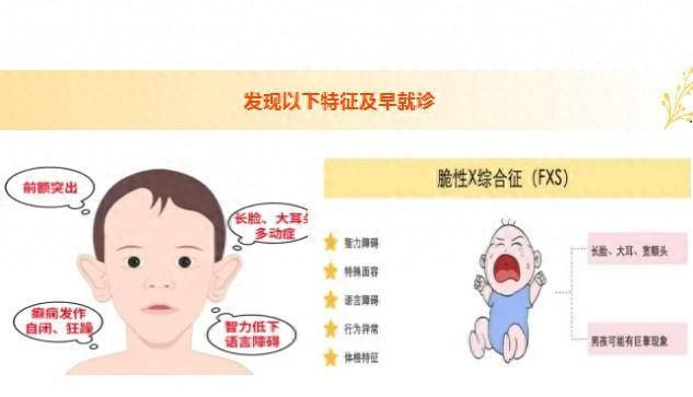胡苏玮建议,发现以下特征及早就诊。1.大而突出的耳朵、长脸、青春期后男性睾丸较大。2.语言发育明显迟缓;学习困难、智力障碍;社交焦虑;避免眼神接触(自闭症);注意力不集中、多动;重复拍手、咬手;对声音、触摸等刺激反应过度。对于脆性X综合征而言,筛查特别重要。如果母亲是携带者,儿子有50%概率患病,女儿有50%概率成为携带者(部分可能轻度患病)。外婆传给妈妈时可能只是前突变无症状,但妈妈传给孩子时可能变成全突变而发病。早期康复训练、行为疗法等能显著改善孩子生活质量。