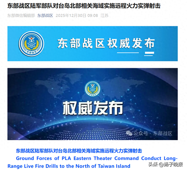 据东部战区,东部战区新闻发言人李熹海军大校表示,12月30日9时00分,中国人民解放军东部战区陆军部队,组织对台岛北部相关海域,实施远程火力实弹射击,取得了预期效果。