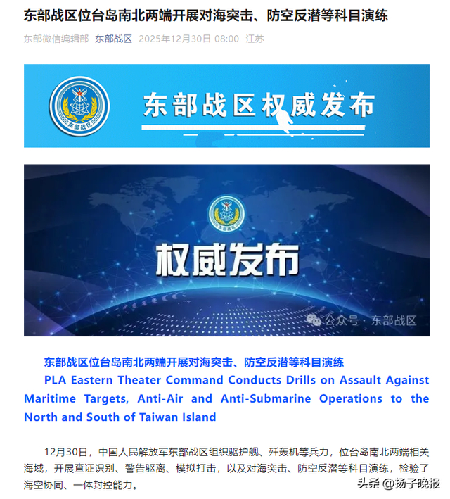 12月30日,中国人民解放军东部战区组织驱护舰、歼轰机等兵力,位台岛南北两端相关海域,开展查证识别、警告驱离、模拟打击,以及对海突击、防空反潜等科目演练,检验了海空协同、一体封控能力。