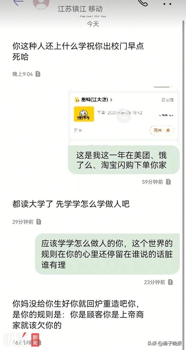 在帖文中,当事大学生还晒出了自己的订单截图,显示其购买了4串卤鸭板肠、猪手半只、贡菜1串、鸭翅1个,以及一个打包盒,上面备注“加热加热,要保温袋谢谢老板”。帖文中,还贴出了双方的短信对话截图,对方在短信中不仅辱骂“祝你出校门早点死”,还有“你妈没给你生好你就回炉重造”等言语。根据当事大学生的帖文,涉事店铺为墨鸭黑鸭王镇江江苏大学店。
