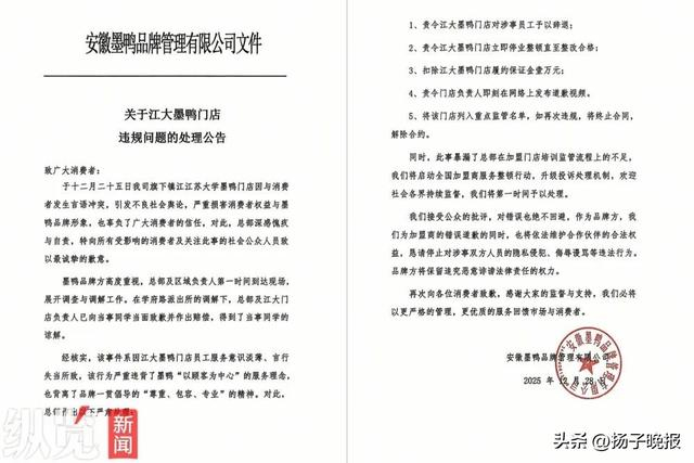 12月28日,安徽墨鸭品牌管理有限公司在官方账号发布了“关于江大墨鸭门店违规问题的处理公告”,公告中称,12月25日,该司旗下镇江江苏大学墨鸭门店与消费者发生言语冲突,在学府路派出所的调解下,总部及江大门店负责人已向当事同学当面致歉并作出赔偿,得到了当事同学的谅解。总部也责令该门店作出辞退涉事员工、停业整顿、门店负责人在网络上道歉等处理。