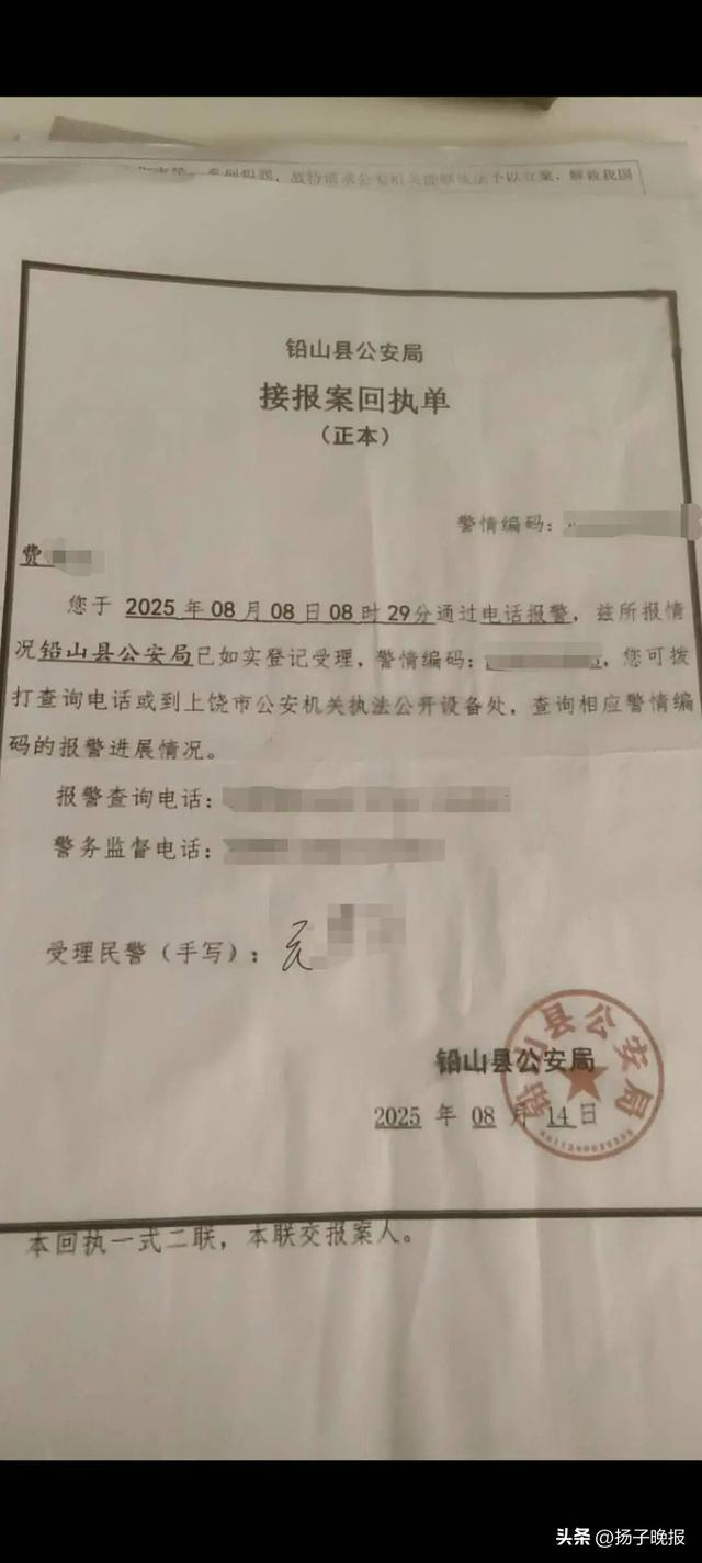 铅山县公安局8月14日出具的报警回执单显示,费女士于8月8日8时29分通过电话报警,所报情况已被公安机关如实登记受理。