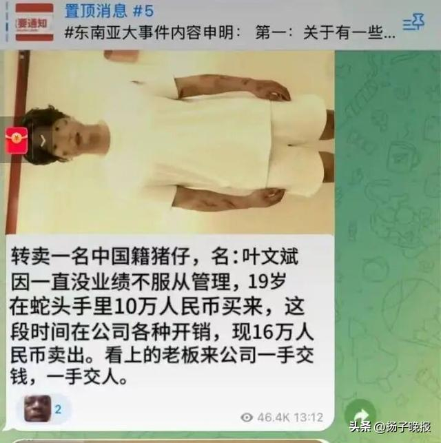 据她提供的群聊截图,群内有信息称,“转卖一名中国籍猪仔,名:叶文斌,19岁,因一直没业绩不服从管理,在蛇头手里10万人民币买来,这段时间在公司各种开销,现16万人民币卖出。看上的老板来公司一手交钱,一手交人。”