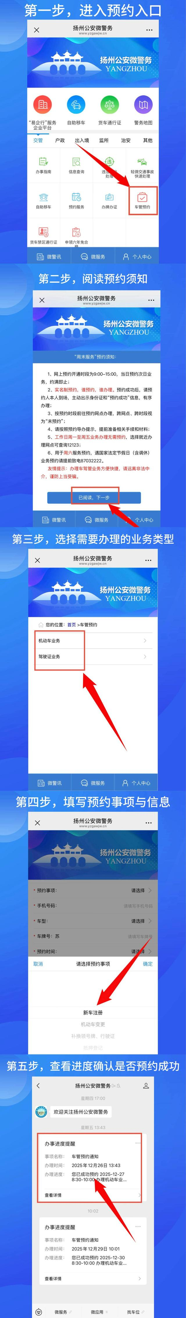 记者了解到,2026年1月1日起,扬州市车管所在“扬州公安微警务”开通了“周末服务”网上预约功能,市民群众可通过服务号实名认证后自主预约。工作日周一至周五无需预约,可通过12123APP 查询选择就近业务网点办理。周六可办业务为:驾驶证期满换证,补领驾驶证;国产小型汽车注册(需预约)、小型车变更颜色(需预约)、小型车变更使用性质(需预约);补换领号牌(小型车)、机动车解抵押。