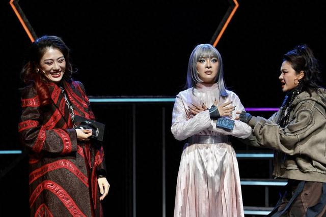 该剧的舞台视觉呈现也极具风格化,强化了剧作的核心冲突。从空中俯瞰,整个舞台空间呈“八”字形结构,墙面融合赛博朋克的光影质感与工业风的冷峻线条,营造出既未来又疏离的氛围。灯光设计匠心独运,通过冷峻的全局环境光与家庭区域相对暖光的鲜明对比,不仅划分了物理空间,更隐喻了数据世界与情感世界、冰冷逻辑与温暖牵绊之间的无形疆界,直观地引导观众沉浸于这场关于何以为人、何以为爱的思辨剧场之中。