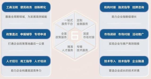 园区立足企业全生命周期发展需求,系统布局了总部办公、产研基地及定制化独栋等多元产业空间,配备多媒体路演厅、共享会议室等商务配套设施,以及智慧食堂、精品公寓、便利商街和运动场馆等生活服务空间,并精心打造屋顶花园、景观平台及近2万平方米的绿化景观,将生态理念融入园区肌理。项目构建了“六大产业运营服务体系”,打造了涵盖工商、人才、法律、财税等方面的一站式服务平台,从企业资质申报、知识产权保护到精准政策匹配,为入驻企业提供全方位服务及深度价值赋能。
