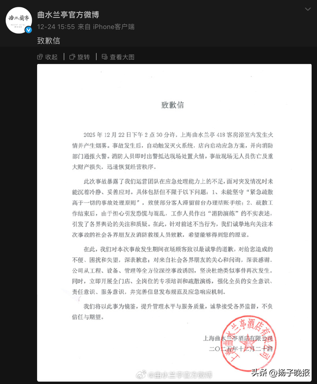 截图来源:解放日报微观上海12月24日,@曲水兰亭官方微博 公开致歉。致歉信称——此次事故暴露了运营团队在应急处理能力上的不足,面对突发情况时未能沉着冷静,妥善应对。具体包括但不限于以下问题: