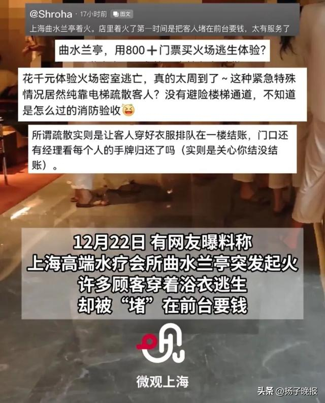 此外,据新京报消息,有顾客在社交平台反映,起火时穿着浴服逃生,但被工作人员“堵”在前台要钱。