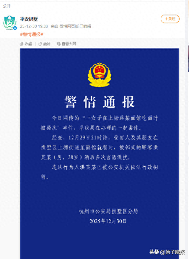 今日网传的“一女子在上塘路某面馆吃面时被骚扰事件”事件,系我局在办理的一起案件。