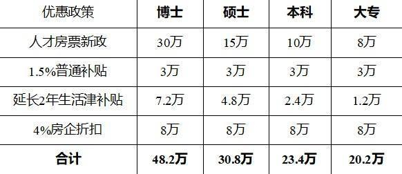 以人才购买200万新建商品住房为例,博士、硕士、本科、大专人才房票补贴金额分别为30万、15万、10万、8万。人才在2026年6月30日前购置新房,都能享受1.5%普通购房补贴(3万元);企业人才生活津补贴延长2年,博士、硕士、本科、大专分别可获生活津贴7.2万、4.8万、2.4万、1.2万。根据买卖双方在议定销售价格基础上可再享4%的专属折扣、最高不超过12万元的规则,人才凭人才房票可额外享受8万元购房折扣。以上三类相加,博士、硕士、本科、大专人才共计可获补贴分别为48.2万元、30.8万元、23.4万元、20.2万元。