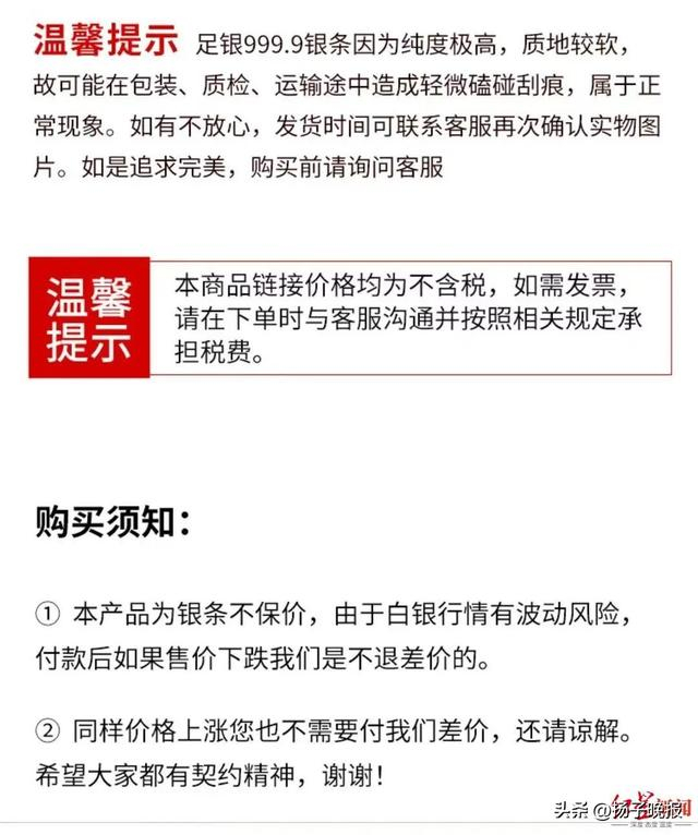“我买的时候,这家店的价格是每克15.3元,别的店铺要贵几毛,我就挑划算的买了。”徐先生说,他总共花费36836元,购买了24个100克规格的银条。该商品的购买须知中写道:“本产品为银条不保价,由于白银行情有波动风险,付款后如果售价下跌不退差价,价格上涨也不需要付差价。”