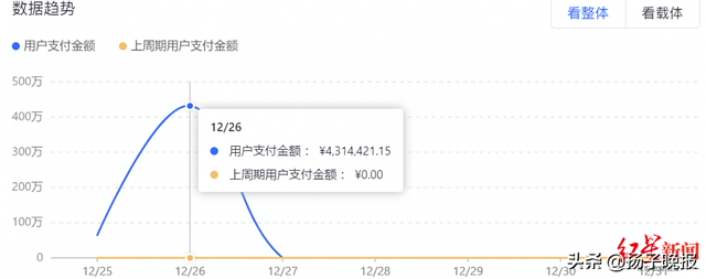 后台数据显示,该店铺销售数据从12月25日开始骤涨,12月26日用户支付金额超431万元,至12月27日销售额归零;而此前一周,该网店销售额为0元。